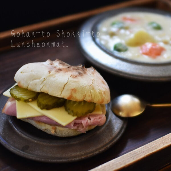 セミハードのパンに発酵バターをぬってももハムとゴーダチーズとピクルスをサンド。